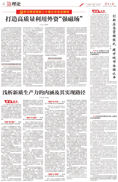 外资是连接国内国际双循环的重要纽带,是畅通生产、流通、消费各环节的重要力量和推动高水平对外开放的重要引擎。党的十八大以来,我国积极推进制度型开放,持续打造市场化、法治化、国际化的营商环境,逐步成为全球跨国投资重要目的地,在吸引和利用外资方面的综合优势日益凸显。根据全球知名管理咨询公司科尔尼发布的全球2024年外商直接投资信心指数(FDICI)报告显示,中国从上年的第七位跃升至第三位,在新兴市场专项排名中位居榜首。作为外资高地,近年来山东通过政策创新、业态创新、模式创新、服务创新等形式,努力吸引更多高质量外资,持续释放吸引外资的“强磁力”。党的二十届三中全会审议通过的《决定》强调“完善高水平对外开放体制机制”,对稳步扩大制度型开放、深化外商投资等方面作出重要部署,为进一步推进高质量利用外资提供了根本遵循。进入新发展阶段,更大力度吸引和利用外资对山东经济发展的重要性不断凸显,是推动技术创新和价值链升级的必然要求,也是山东建设高水平对外开放新高地的有效抓手。