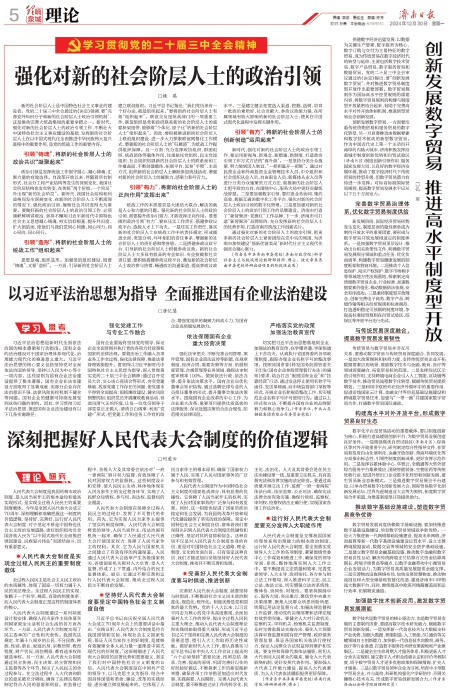 国有企业要始终坚持党的领导,保证企业全面贯彻并执行党的各项方针政策和国家的法律法规。要将法治工作融入各项业务工作全过程,强化法律保障,推进法律管理效能提升。要坚持以习近平新时代中国特色社会主义思想为指导,深入贯彻落实党的二十届三中全会精神;通过召开党员大会、交心谈心座谈会等形式,夯实党建基础,找准党建工作存在的问题,使党建水平得到全面提高;狠抓廉政建设,健全风险预警机制;组织党员开展廉政教育活动,营造风清气正的环境,让每一位党员领导干部堂堂正正做人、清清白白做事;利用“党建+”形式,把党建工作和业务工作有机结合,增强党组织的凝聚力和战斗力,为国有企业高质量发展助力。
