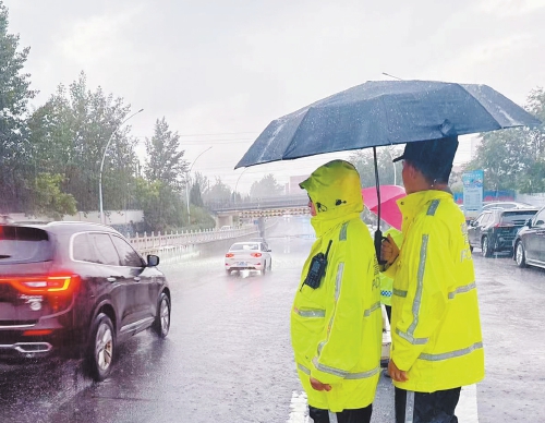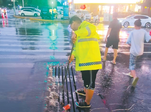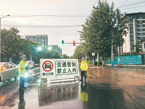 章丘区交通管理大队对积水区进行交通管制。(赵赫 摄)