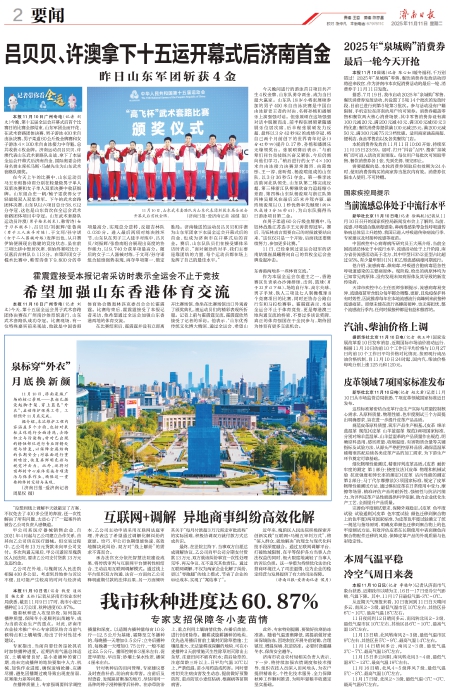 在今天上午的比赛中,山东运动员马玉乐和鲁诗雨分别在轻量级男子单人双桨决赛和女子单人双桨决赛中收获银牌。山东组合史一帆/鲍子雯获得女子轻量级双人双桨季军。下午的武术套路团体决赛,山东队以六项目总分58.612分夺冠,这也是山东首次在全运会武术套路团体项目中夺冠。山东武术套路队运动员许澳(男子枪术剑术)、韩雪诗(女子刀术棍术)、吕贝贝/刘振辉/张鲁南(男子三人徒手对练)、于文珂/孙守诺(女子二人器械对练)发挥出色,从开赛伊始便展现出稳健的竞技状态,虽在前三项比拼中暂居次席,但始终紧咬比分,仅落后吉林队0.113分。在第四项女子棍术比赛中,韩雪诗拿下9.800分的单项最高分,实现总分逆转,反超吉林队0.030分。进入最后两项对练决胜环节,山东队在男子三人徒手对练中,吕贝贝/刘振辉/张鲁南组合展现出高度的协作能力,以9.740分获单项最高分。随后的女子二人器械对练,于文珂/孙守诺组合延续强势表现,再夺单项第一,锁定胜局。济南输送的运动员吕贝贝和许澳为山东军团拿下本届全运会开幕式后的首金,也成为济南市在开幕式后的首金。赛后,山东队队员们在接受媒体采访时表示,“面对强劲的对手,我们主要是靠团结的力量,每个运动员都在场上发挥了自己的最佳水平。”