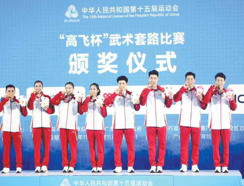 11月10日,山东武术套路队为山东代表团斩获本届全运会开幕式后首枚金牌。 (济南日报·爱济南记者 崔健 摄)
