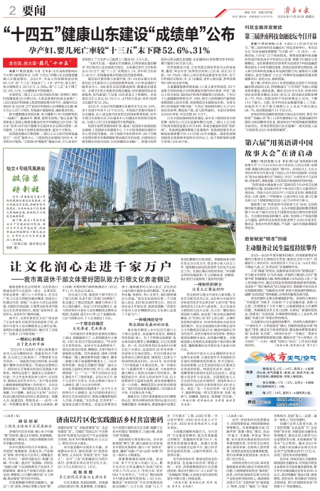 在养老服务方面,山东巩固全国医养结合示范省成果,建成“两证齐全”医养结合机构1125家,床位33万张。96.5%的二级以上综合医院设置老年医学科,安宁疗护病区实现县(市、区)全覆盖,老年心理关爱、营养改善等6项行动全面开展。