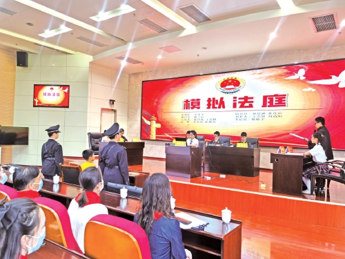 济南市景山小学学生在历下区人民检察院开展模拟法庭活动。