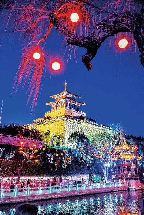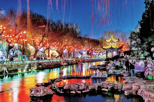流光溢彩的护城河以泉水为墨、灯火作彩,绘就一幅流动的春节画卷。