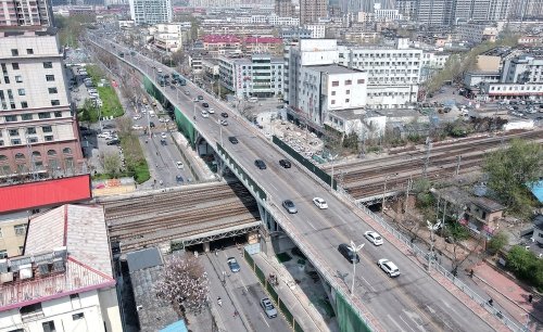 据了解,施工路段为纬二路跨铁路天桥全段,施工重点对天桥引桥进行维修改造,针对桥梁结构老化、设施陈旧等问题精准施策,通过桥墩加固、桥面修缮、附属设施更新等工序,全面消除安全隐患,在保留历史风貌的基础上,同步提升桥梁安全性能与市民通行体验。采取全天施工模式,桥下全天占用桥梁两边内侧一条3.5米宽车道进行施工,对道路进行横断面重塑。施工期间,天桥桥下道路仍保持通行,不实施全段封闭,仅根据施工需要调整车道配置,保障机动车、非机动车和行人安全通行。 (济南日报·爱济南记者 崔健 摄)