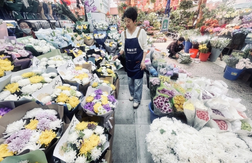 4月2日,随着清明节临近,济南不少市民前往花卉市场选购素色鲜花。白菊、黄菊、百合、康乃馨等花卉搭配而成的花束款式新颖,成为市场热销品。